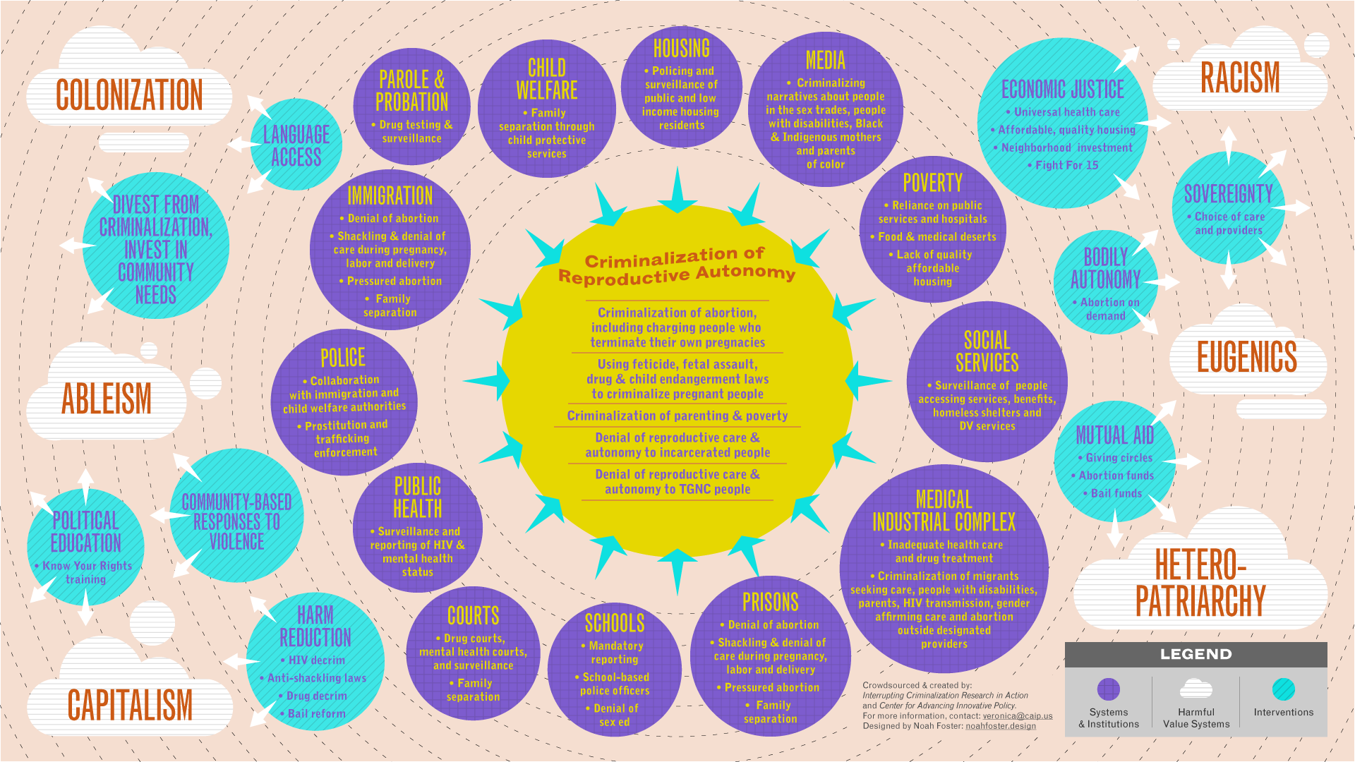 This map was created to show how the criminalization of reproductive autonomy functions, and how it is all part of a larger web. There are many sites and mechanisms of criminalization of reproductive autonomy in this violent system—which also means there are many points and opportunities for intervention and resistance available to us.